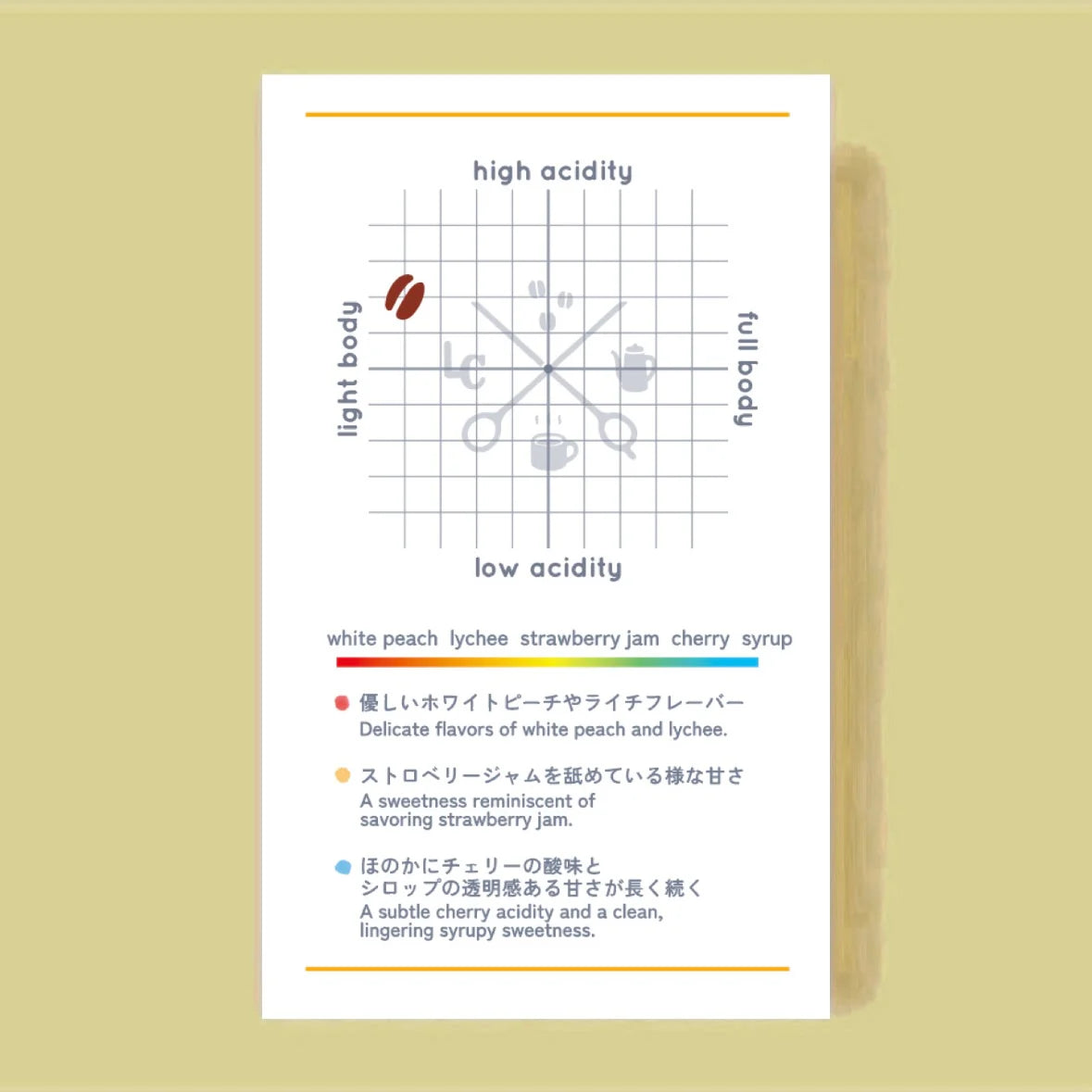 A light roast blend (level 1) combining premium beans from Ethiopia, Uganda, and Colombia. Rich and fruity with flavor notes of white peach, lychee, strawberry jam, cherry, and sweet syrup. Suitable for both filter and espresso brewing.