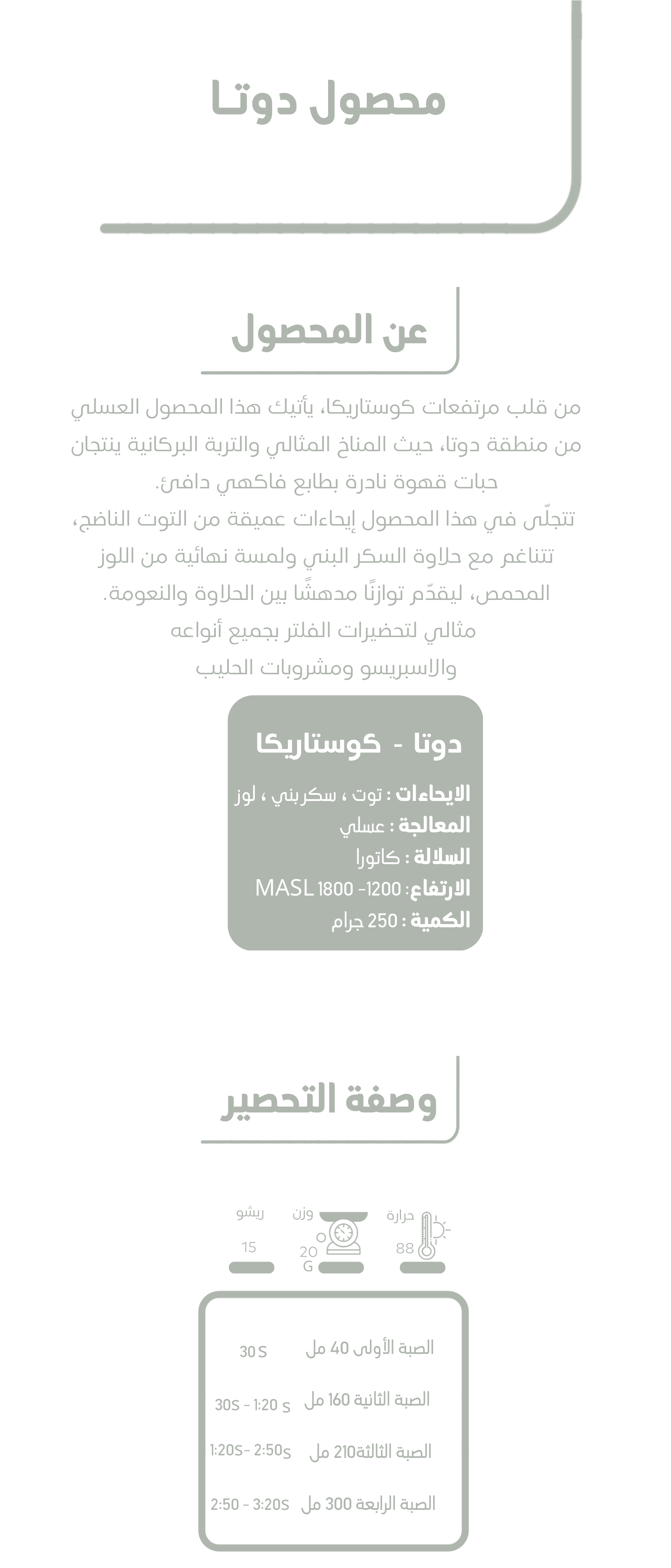 من قلب مرتفعات كوستاريكا، يأتيك هذا المحصول العسلي من منطقة دوتا، حيث المناخ المثالي والتربة البركانية ينتجان حبات قهوة نادرة بطابع فاكهي دافئ. تتجلّى في هذا المحصول إيحاءات عميقة من التوت الناضج، تتناغم مع حلاوة السكر البني ولمسة نهائية من اللوز المحمص.