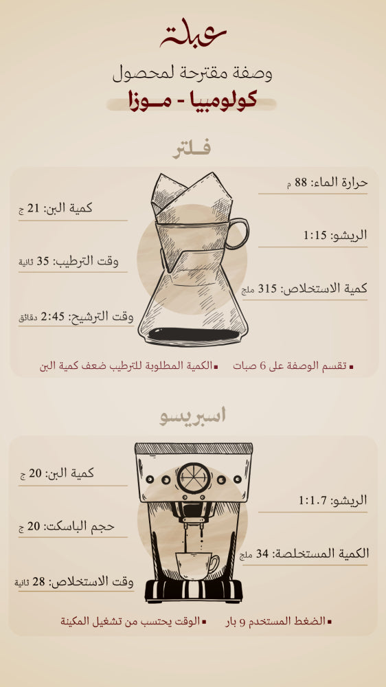 من منطقة كاوكا الجبلية في كولومبيا، يأتي محصول موزا الاستثنائي من سلالة كاتورا المميزة. تُشتهر هذه المنطقة بتربتها البركانية الغنية ومناخها البارد الذي يبطئ نضج حبات البن، مما يمنحها تعقيداً نكهياً استثنائياً. يُزرع على ارتفاع 1950 متراً ويُعالج بطريقة التجفيف المطول التي تبرز الحلاوة الطبيعية. يتميز بإيحاءات فواكه استوائية - حلاوة واضحة مع قوام ممتلئ وكريمي، مما يجعله خياراً مثالياً لكل من الإسبريسو والفلتر.