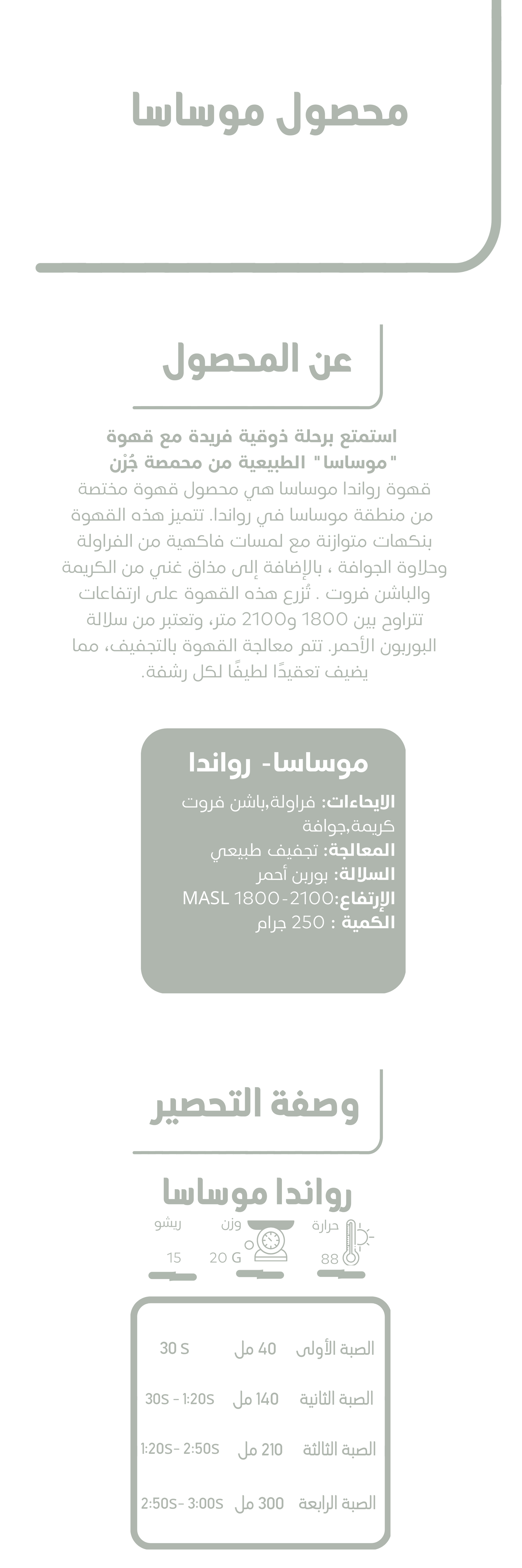 استمتع برحلة ذوقية فريدة مع قهوة "موساسا" الطبيعية من محمصة جُرْن. قهوة رواندا موساسا هي محصول قهوة مختصة من منطقة موساسا في رواندا. تتميز هذه القهوة بنكهات متوازنة مع لمسات فاكهية من الفراولة وحلاوة الجوافة، بالإضافة إلى مذاق غني من الكريمة والباشن فروت.